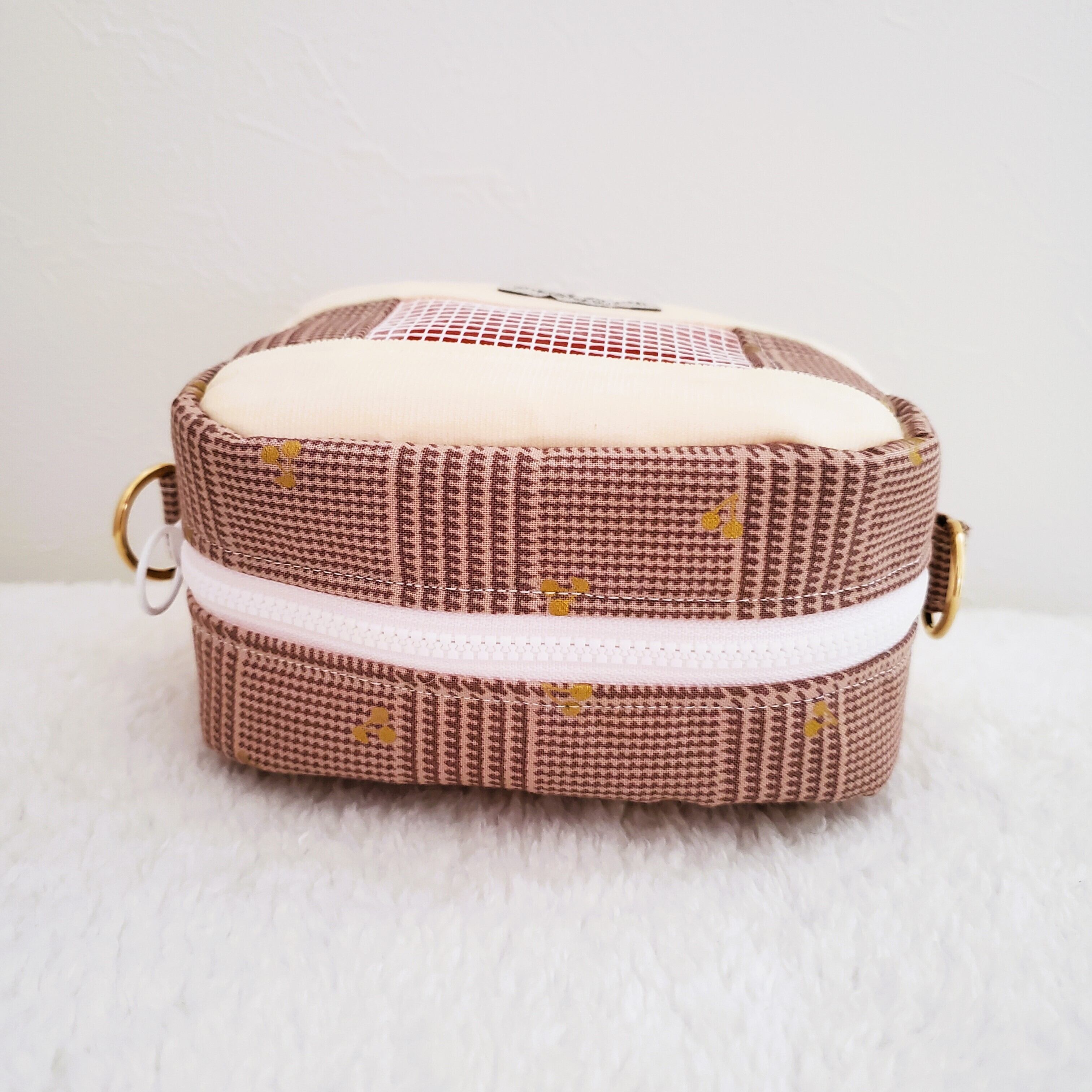 ショルダー紐はポーチとお揃いの布でお作りしました。アクリルテープの上に布を縫い付けておりますので強度もしっかりございます(*ฅ́˘ฅ̀*)♡金具はゴールドを使用。いつものお出かけポーチよりワンランク上の高見えポーチにお仕上げしました♡